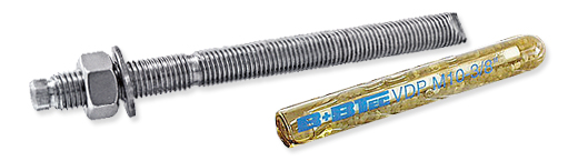 The B+BTEC VDP Spin Capsule is a special glass capsule filled with liquid resin and quartz sand aggregate. Inside the capsule is a smaller glass capsule containing the resin hardener. The anchorage is made by placing the VDP capsule in a drilled hole and then spinning the threaded rod bolt into the capsule, shattering it and mixing the contents. The chemical interaction among the resin, resin hardener, aggregate and glass fragments produces a high strength adhesive which cures quickly to solidly bond the bolt to the surrounding concrete. The anchorage produced is suitable for all types of loading -static, vibratory and shock.