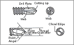 The DX drillpoint closely resembles the drillpoint of a split-point twist drill bit. In the Tenn DX sell all the performance elements - point diameter, point angle, web thickness and flute length - have been carefully calibrated and combined for rapid penetration, The thin chisel edges assure immediate non-walking starts while raked cutting lips, wide spacious flutes and a tapered entry thread provide aggressive penetration with low manual pressure.  |